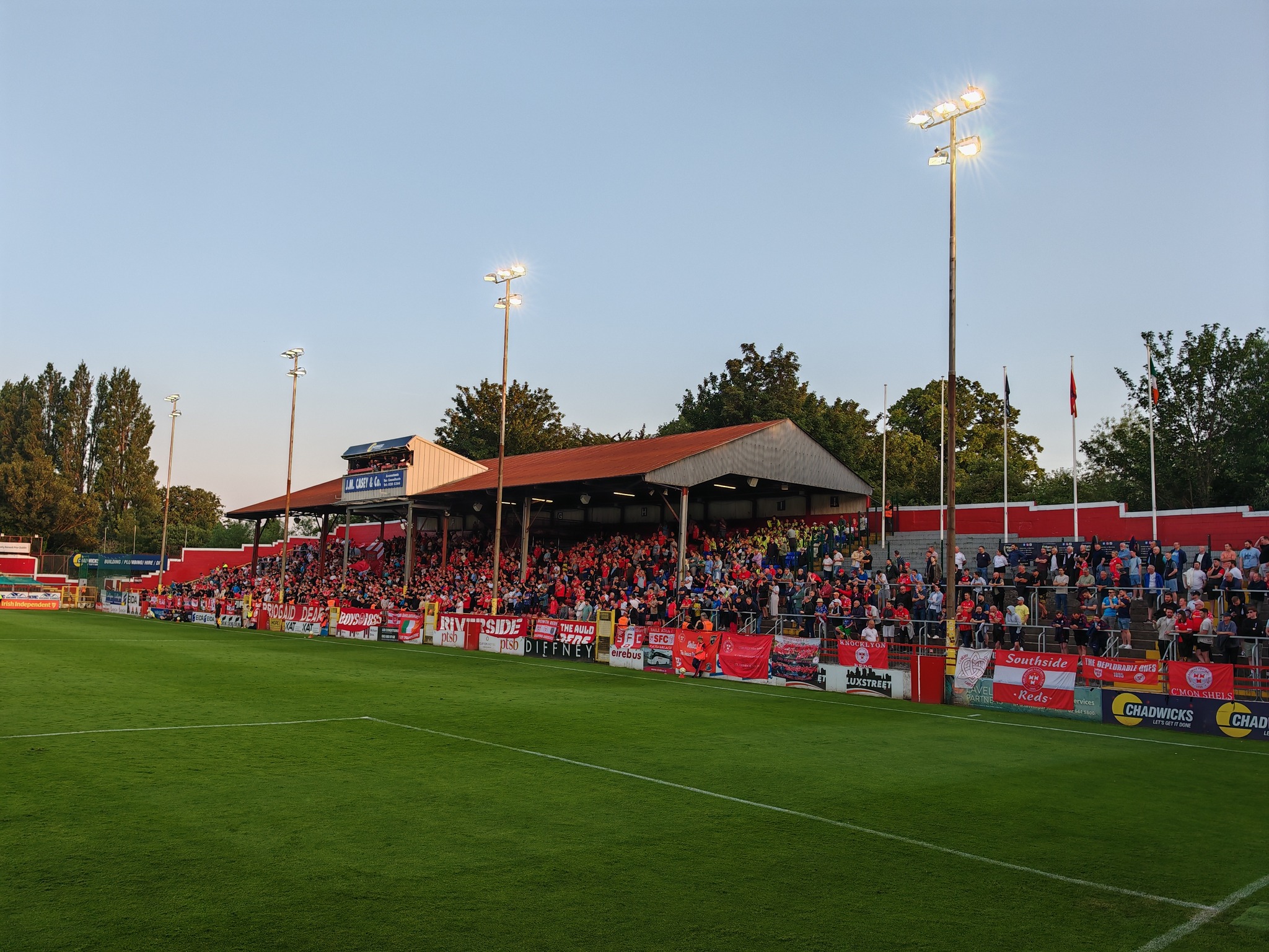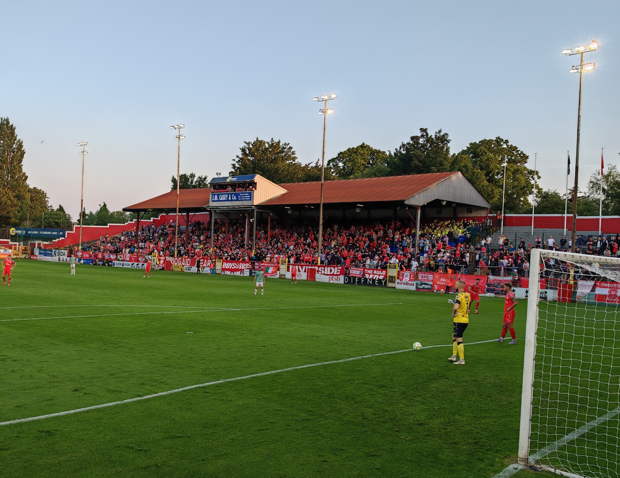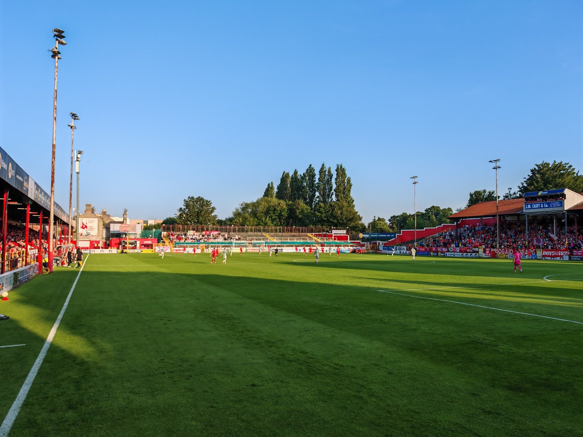 Fast 4.000 Zuschauer darunter eine Busladung Gäste aus Derry kamen an diesem herrlichen Sommerabend in den wunderbar zusammen geschusterten Tolka Park. Eine top Rumpel Bude und trotzdem mit typisch britischer Bauweise. Hier steht man direkt am Spielfeldrand und bekommt als Spieler die Emotionen der Zuschauer aus unmittelbarer Nähe mit.