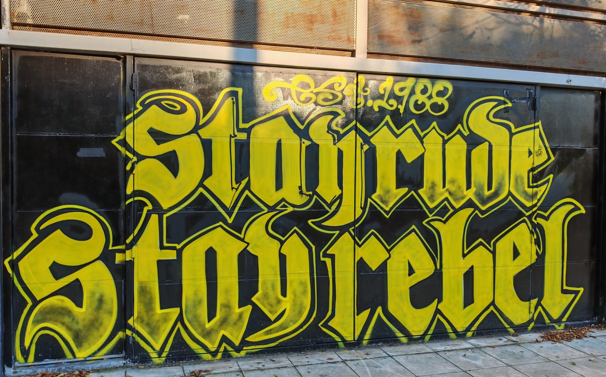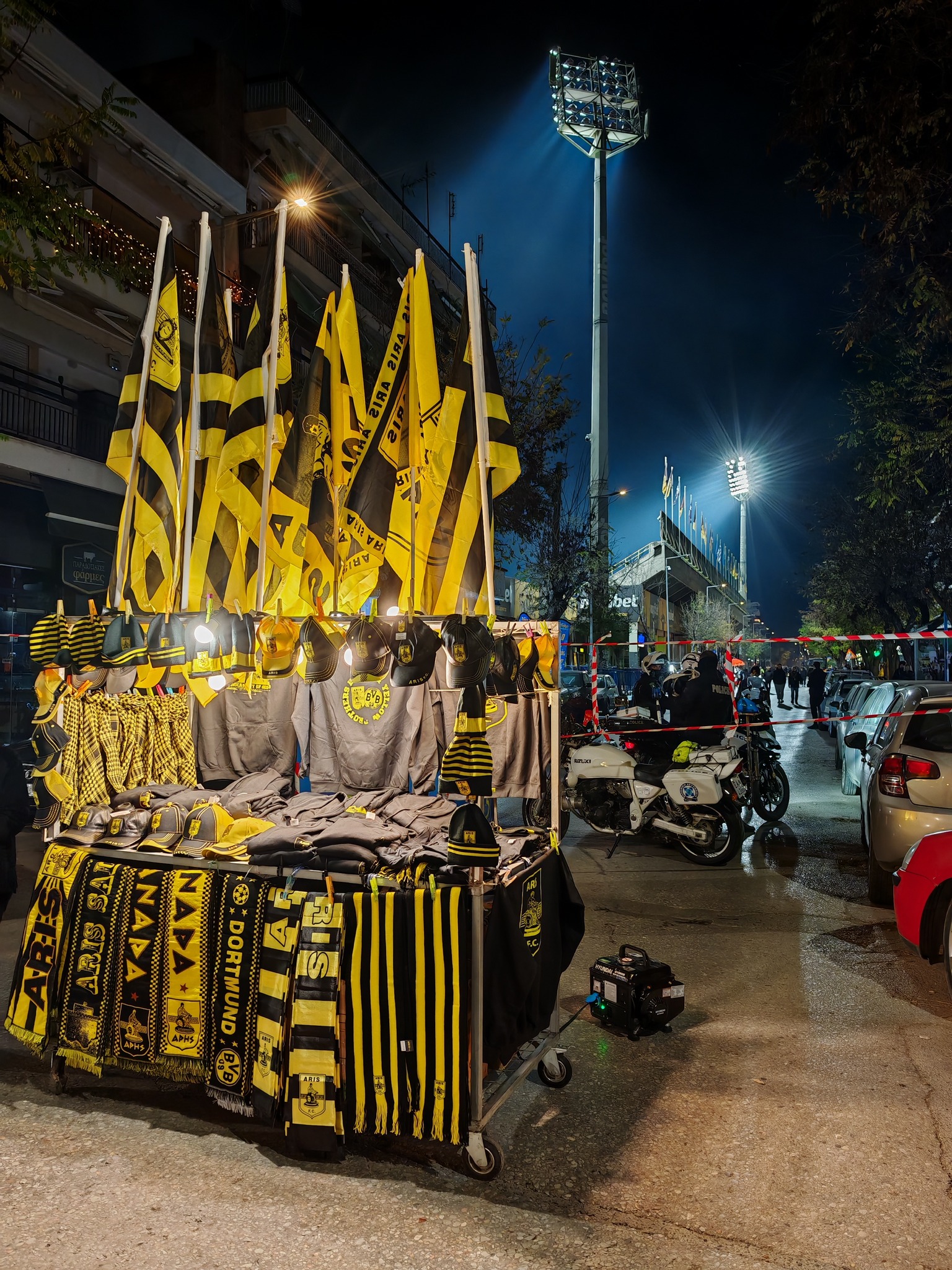 Hier hingen auch schon die ersten Aris Leute ab und stimmten sich in großer bunter Runde mit viel Essen und etwas Alkohol auf das Spiel ein. Auch die Polizei stärkte sich noch mal vor dem Spiel. Das Stadion liegt mitten zwischen Wohnblocks und die gesamte Atmosphäre rund um das Stadion war sehr angenehm.