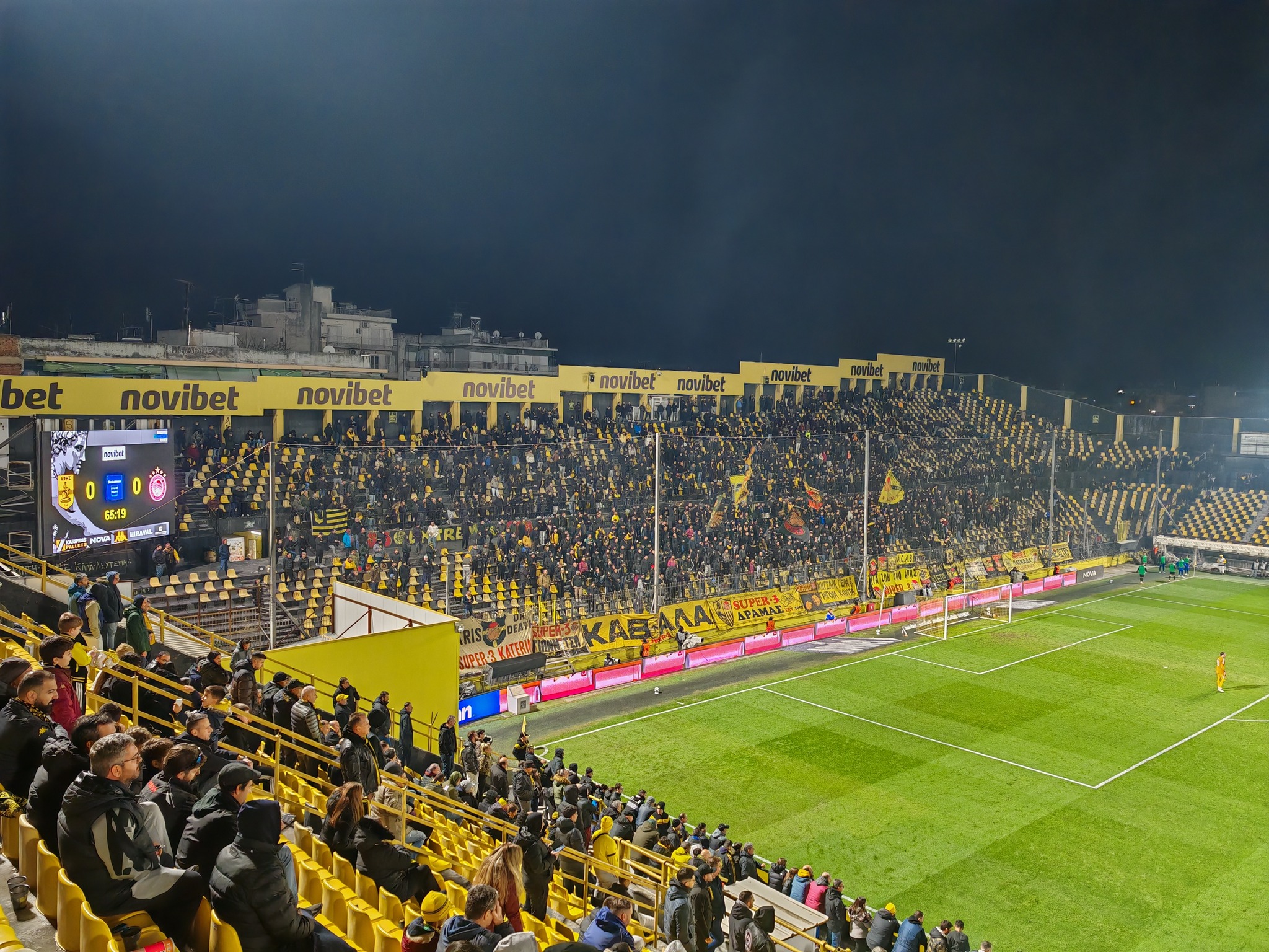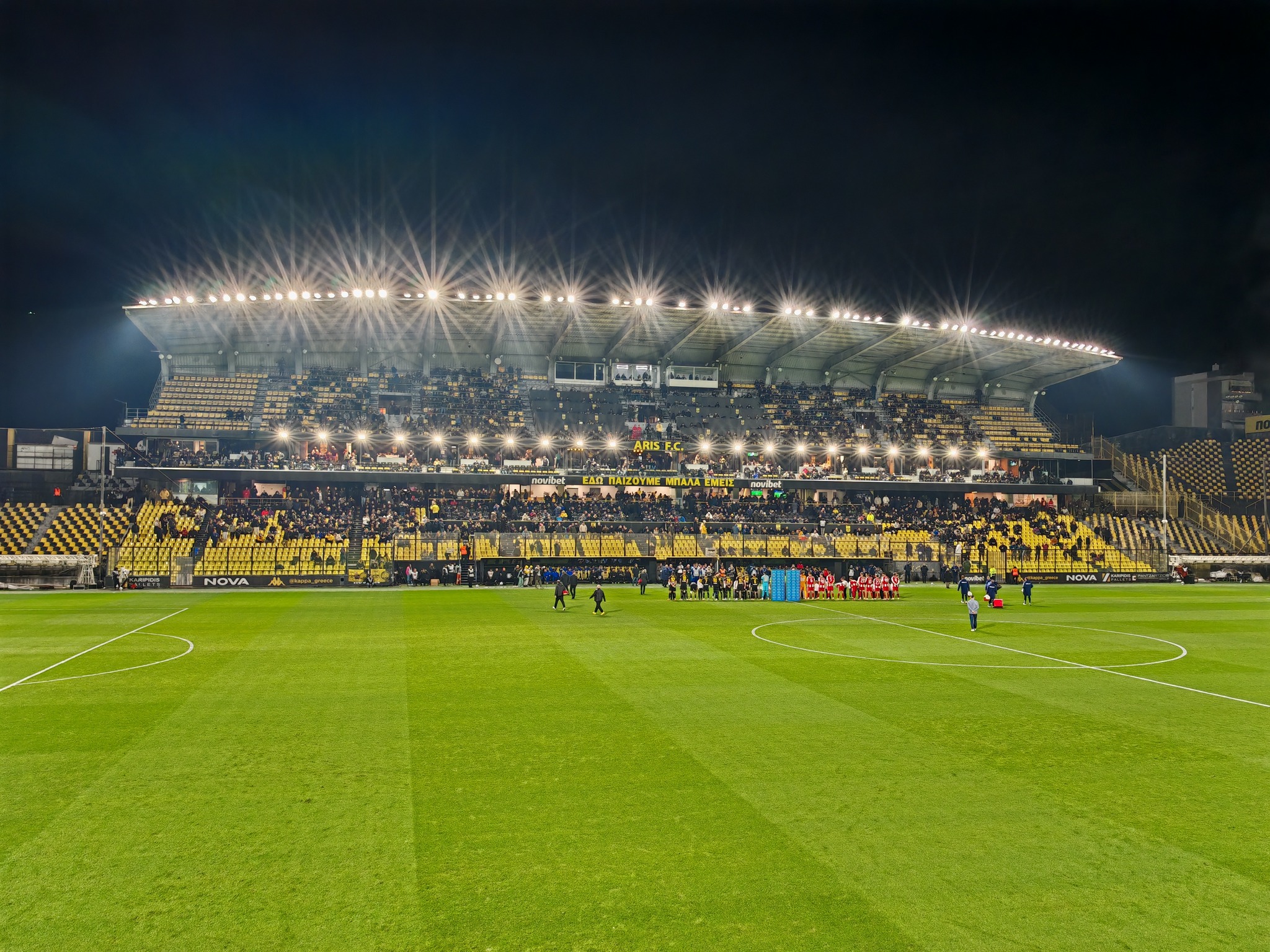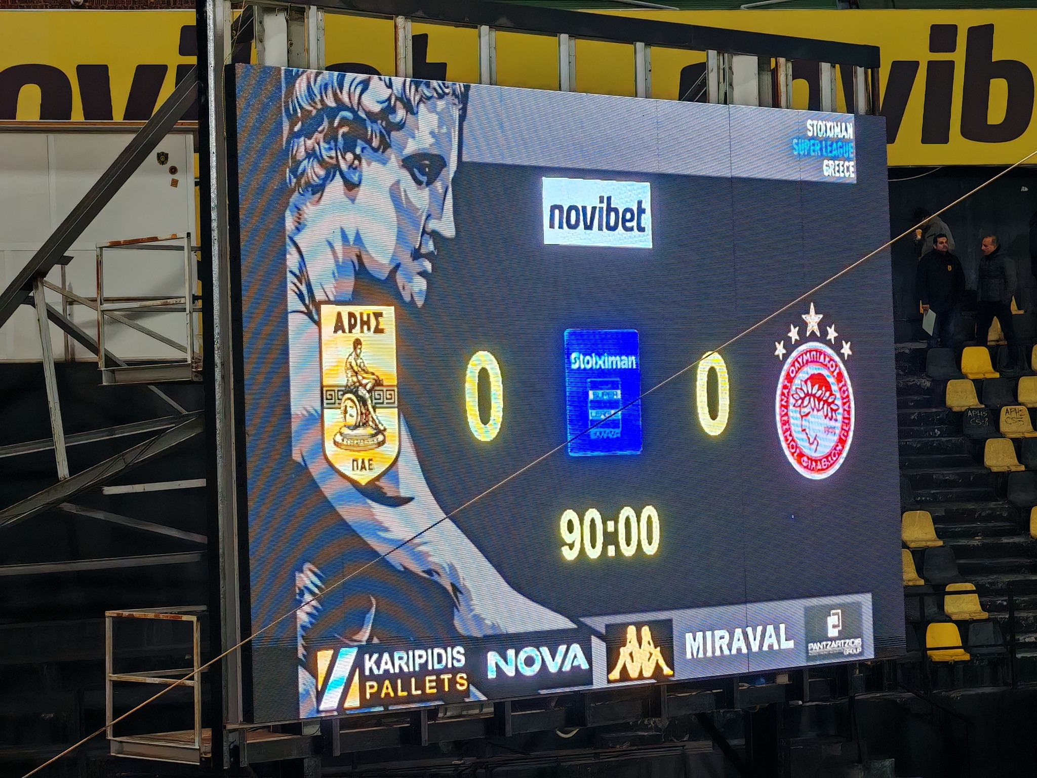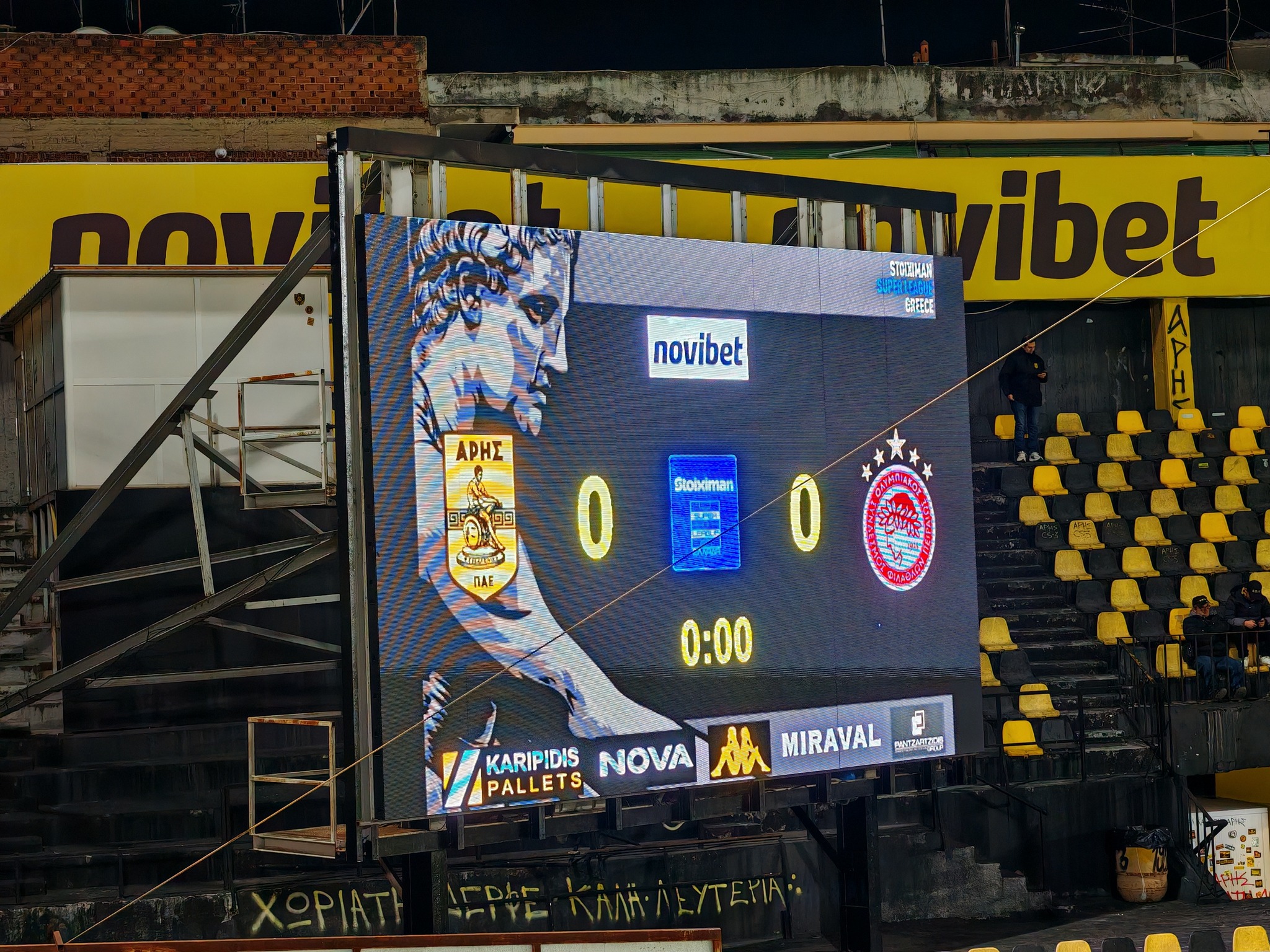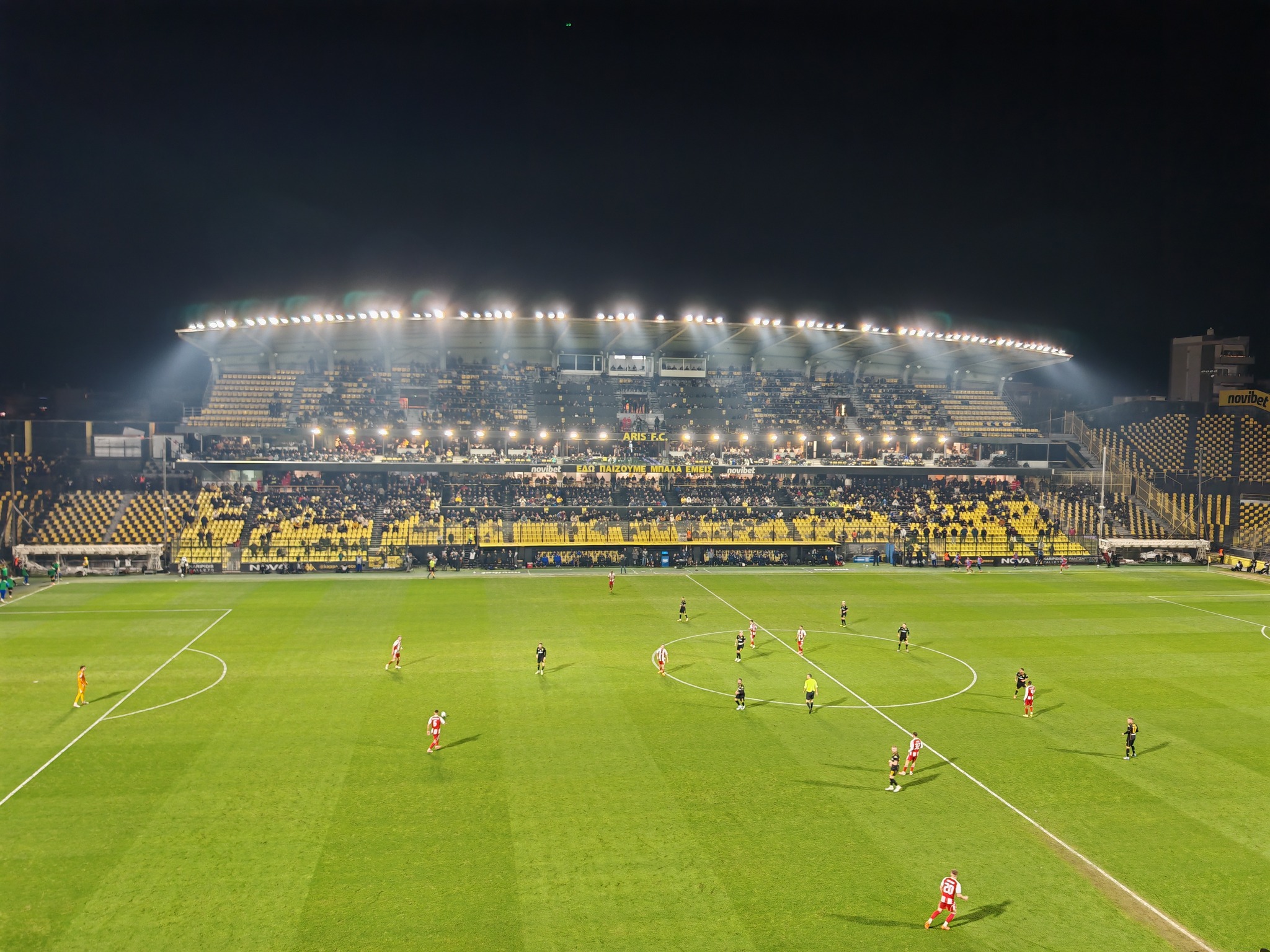 Knapp 5.000 Zuschauer kamen zum Sonntag Abend Top Spiel ins Stadio Harilaou Kleánthis Vikelídis. Aris dümpelt im oberen Mittefeld der Tabelle rum und schlug sich wacker gegen den Spitzenreiter aus Piräus. In der 51ten Minute bekommt Olympiacos eine gelb-rote Karte und somit war die Chance da gegen den Favoriten etwas zu reißen.